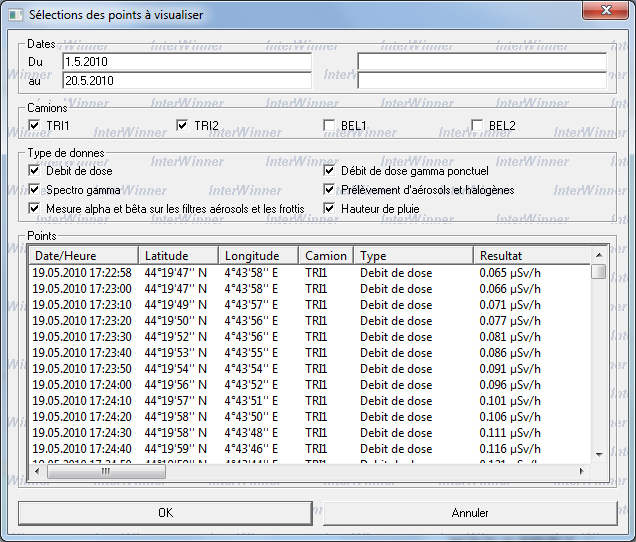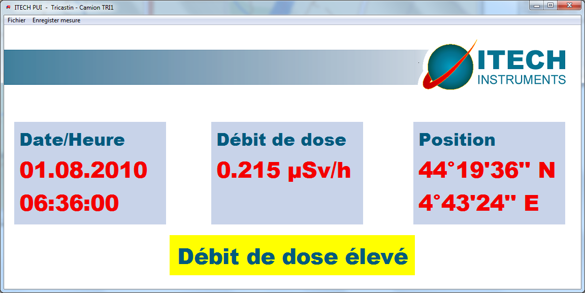 A NaI acquisition chain, consisting of the InterWinner and a Venus analyzer is integrated into the system. The results of the analysis are stored in the data base together with the location where the sample was taken.